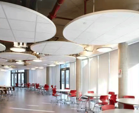 独立悬挂具有自由开放式设计,结合活泼的表面形状与绚丽色彩组合,给厅堂全新感觉。多种几何图案吊顶为您提供创意吸音解决方案,带来声学舒适性。特别适用于正常吊顶无法应用的区域。